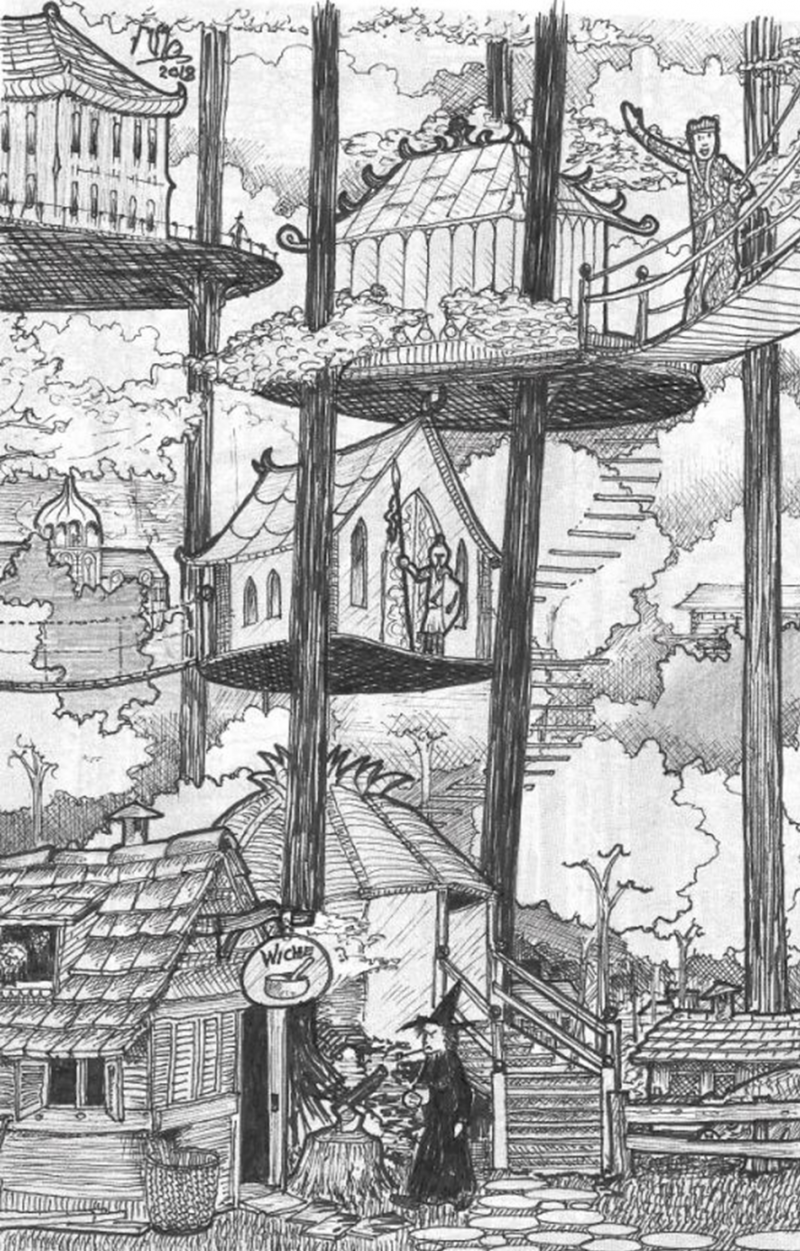 In the great bowls of the tree roots can be found little shops and workshops producing exquisite utensils and objets d’art. Above this are meeting rooms and balconies for the chattering classes to pass the day and then the main theatre areas where hundreds can enjoy special performances.