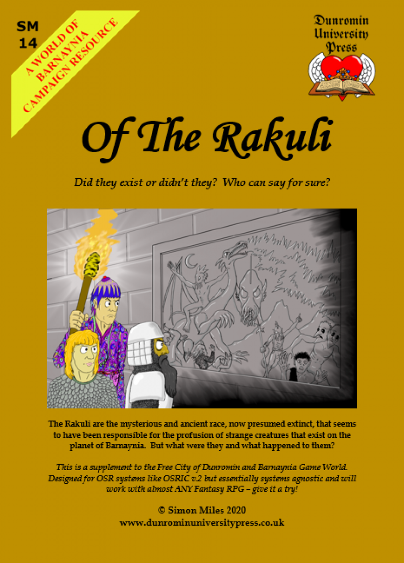 “SM14 Of the Rakuli” is the latest publication by Dunromin University Press. The Rakuli of the title is the elven name for the Great Old Ones who once ruled Barnaynia completely, up until about 90,000 years ago, when they just seemed to vanish. So completely and suddenly did they go that they have since passed progressively into history, legend, myth and fairy story, before being pretty much forgotten by everyone.